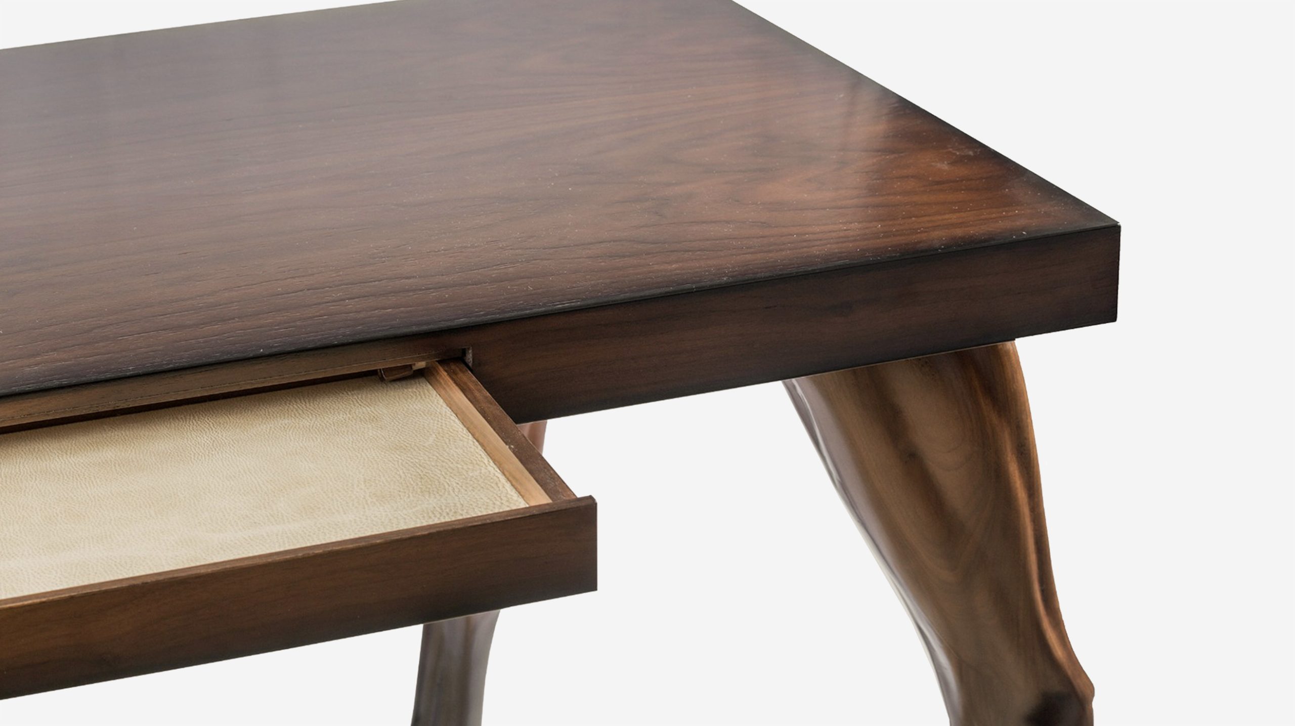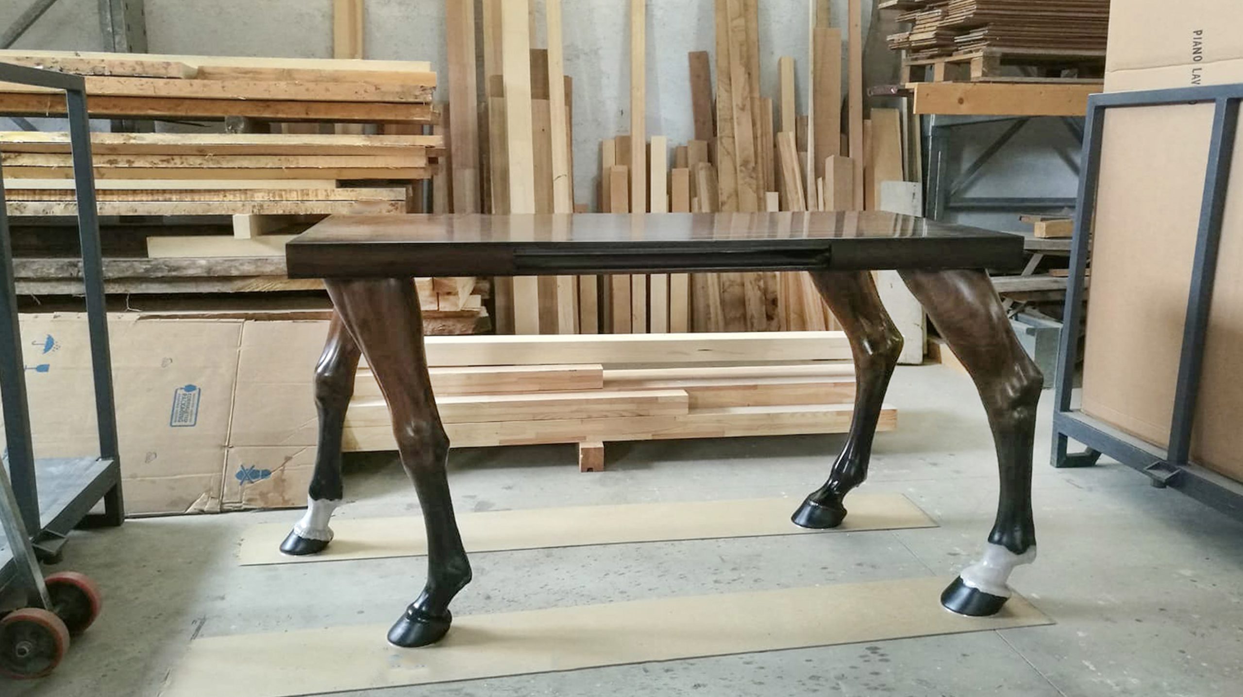 The desk was made in Italy with superior craftsmanship, no expenses were spared. The legs were carved for 15 day and nights non stop in a 5 Axis CNC machine, and the three-color-gradient paint job, took two and a half weeks process. The walnut is of the highest quality hand picked and book-matched and with metal reinforcement in the construction of the desk it is as strong as a horse. Custom made chromed horseshoe were fitted for additional detail and preserve the wood from wear against the floor surface.