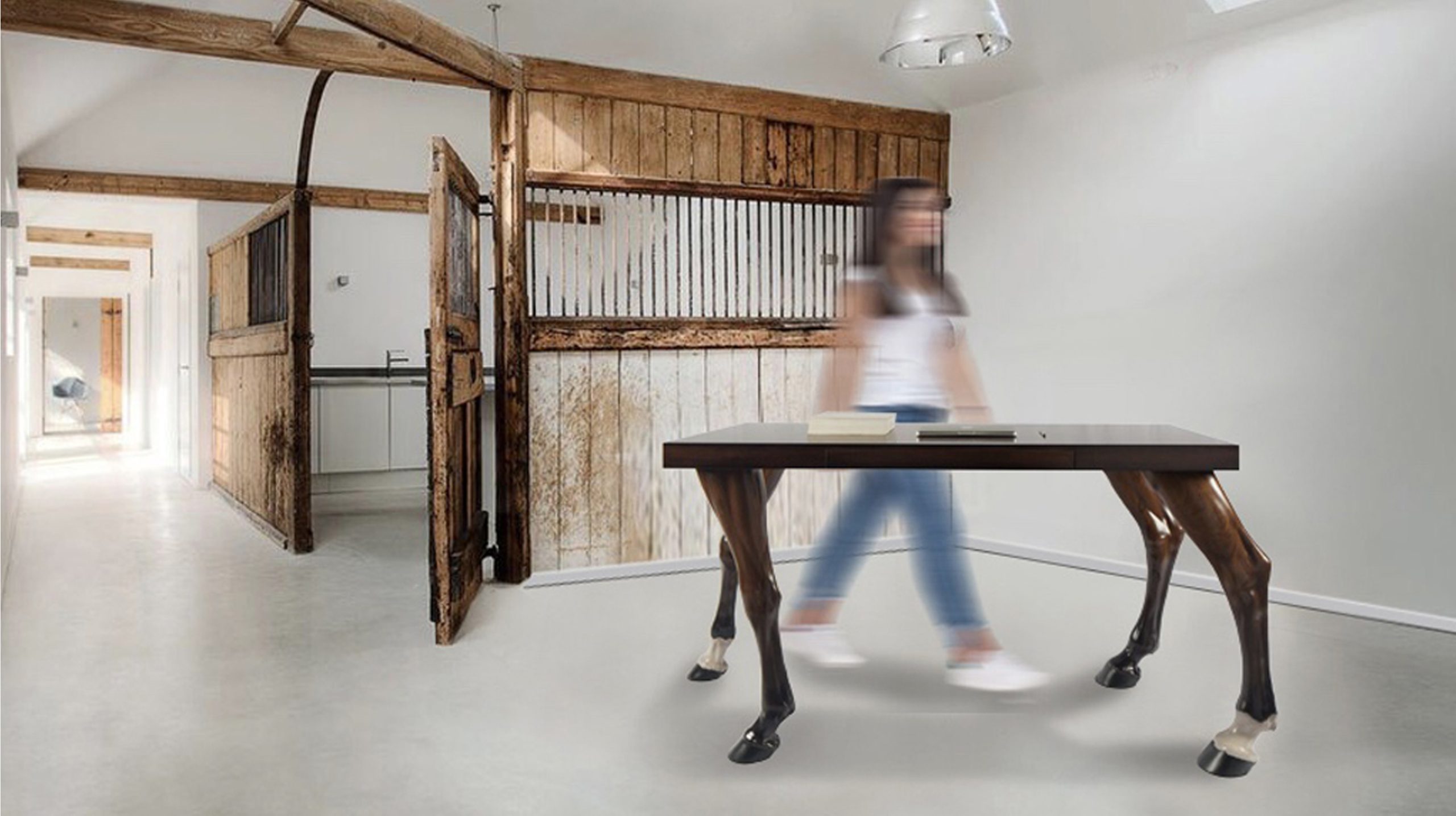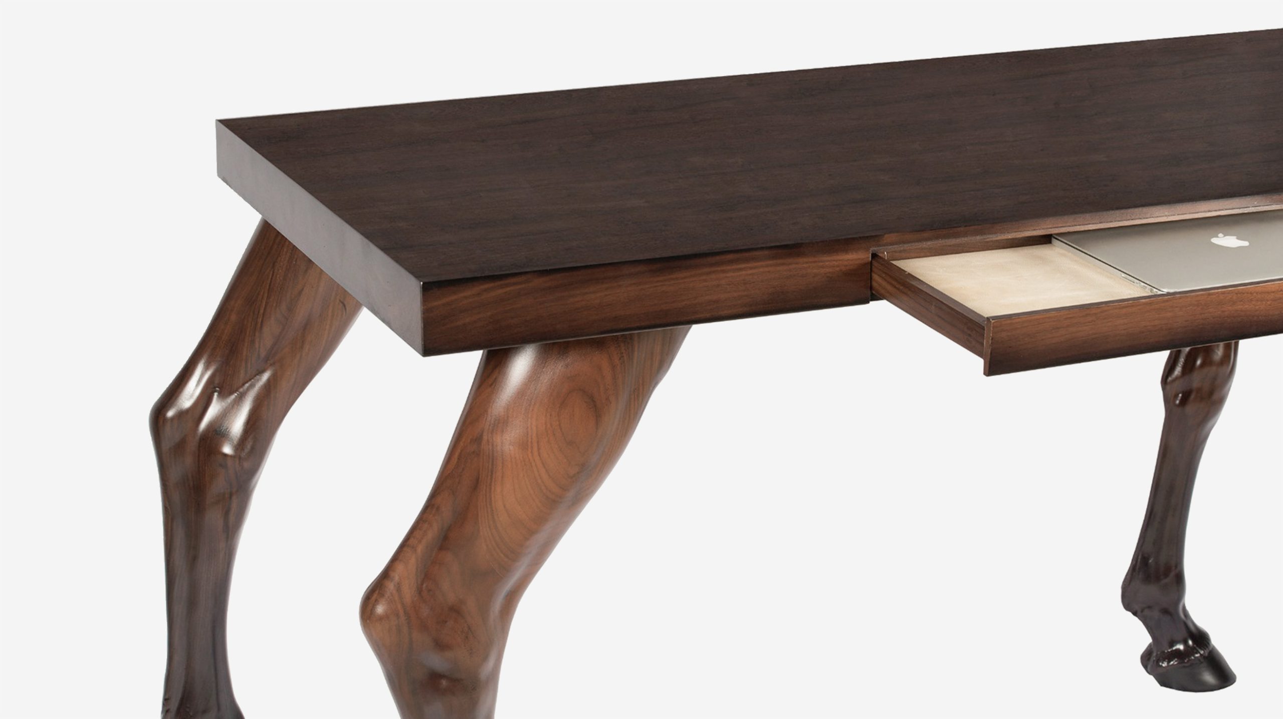 The Workhorse was conceived as an attempt to make the everyday office space less mundane and more alive. By combining the linear surface of a desk with the soft, warm curves of equestrian legs the Workhorse was intended to join work with play, office with countryside; to bring the outside in. Rather than being tied to a desk, the user is inspired with the freedom of riding with their thoughts.